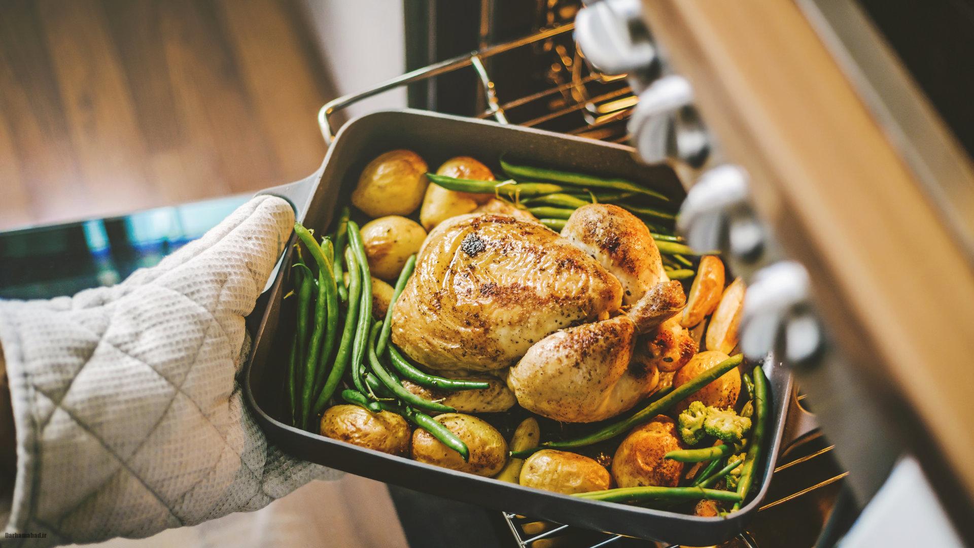 بعد از ایجاد رویه طلایی، مواد غذایی را به فر یا آرامپز منتقل کن تا با حرارت ملایم و یکنواخت داخلی پخته شود. این مرحله باعث نرم و آبدار شدن گوشت و سبزیجات و حفظ طعم طبیعی آنها میشود. حرارت غیرمستقیم کنترل بیشتری روی پخت ایجاد میکند و از خشک شدن غذا جلوگیری میکند.